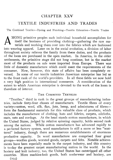 Textile Industries and Trades, ---. Workers of the Nation: An Industrial Encyclopedia of the Occupations of the American People, 1906, 7 pages. Posted July 22, 2003. SAMPLE PAGE. File size 972 KB PDF