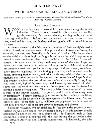 Wool and Carpet Manufactures, ---. Workers of the Nation: An Industrial Encyclopedia of the Occupations of the American People, 1906, 8 pages. Posted July 22, 2003. SAMPLE PAGE. File size 1 MB PDF