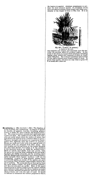 Bambusa, ---. Zell's Encyclopedia, 1876, 1 page. Posted April 11, 2004. SAMPLE PAGE. File size 440 KB PDF