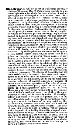 Bleaching, ---. Zell's Encyclopedia, 1876, 1 page. Posted April 11, 2004. SAMPLE PAGE. File size 432 KB PDF