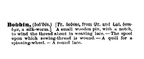 Bobbin, ---. Zell's Encyclopedia, 1876, 1 page. Posted April 12, 2004. SAMPLE PAGE. File size 396 KB PDF