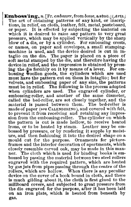 Embossing, ---. Zell's Encyclopedia, 1876, 1 page. Posted April 12, 2004. SAMPLE PAGE. File size 424 KB PDF