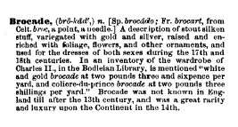 Brocade, ---. Zell's Encyclopedia, 1876, 1 page. Posted April 12, 2004. SAMPLE PAGE. File size 400 KB PDF