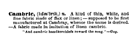 Cambric, ---. Zell's Encyclopedia, 1876, 1 page. Posted April 17, 2004. SAMPLE PAGE. File size 396 KB PDF