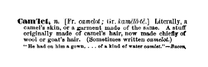 Camlet, ---. Zell's Encyclopedia, 1876, 1 page. Posted April 17, 2004. SAMPLE PAGE. File size 396 KB PDF