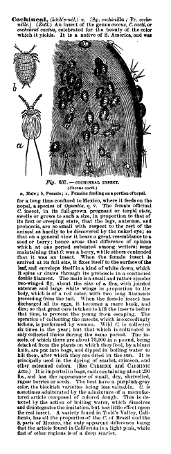 Cochineal, ---. Zell's Encyclopedia, 1876, 1 page. Posted May 2, 2004. SAMPLE PAGE. File size 460 KB PDF