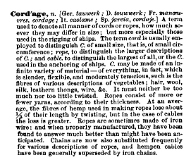 Cordage, ---. Zell's Encyclopedia, 1876, 1 page. Posted April 22, 2004. SAMPLE PAGE. File size 408 KB PDF