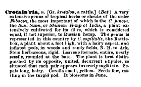 Crotalaria, ---. Zell's Encyclopedia, 1876, 1 page. Posted April 22, 2004. SAMPLE PAGE. File size 404 KB PDF