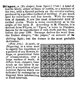 Diaper, ---. Zell's Encyclopedia, 1876, 1 page. Posted April 22, 2004. SAMPLE PAGE. File size 416 KB PDF