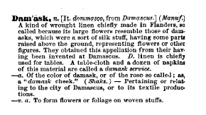 Damask, ---. Zell's Encyclopedia, 1876, 1 page. Posted April 22, 2004. SAMPLE PAGE. File size 400 KB PDF