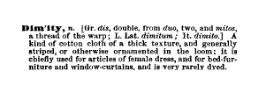 Dimity, ---. Zell's Encyclopedia, 1876, 1 page. Posted April 22, 2004. SAMPLE PAGE. File size 396 KB PDF