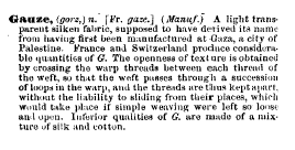 Gauze, ---. Zell's Encyclopedia, 1876, 1 page. Posted April 23, 2004. SAMPLE PAGE. File size 400 KB PDF