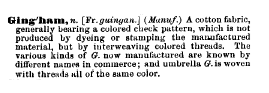 Gingham, ---. Zell's Encyclopedia, 1876, 1 page. Posted April 23, 2004. SAMPLE PAGE. File size 396 KB PDF