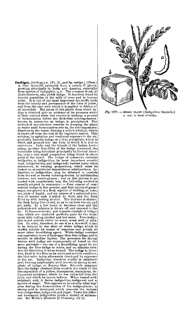 Indigo, ---. Zell's Encyclopedia, 1876, 1 page. Posted January 9, 2004. SAMPLE PAGE. File size 460 KB PDF