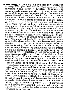 Knitting, ---. Zell's Encyclopedia, 1876, 1 page. Posted April 23, 2004. SAMPLE PAGE. File size 420 KB PDF