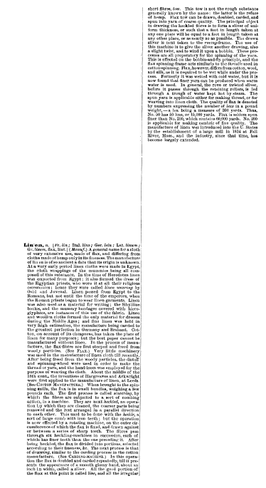 Linen, ---. Zell's Encyclopedia, 1876, 1 page. Posted January 9, 2004. SAMPLE PAGE. File size 476 KB PDF