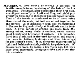 Mohair, ---. Zell's Encyclopedia, 1876, 1 page. Posted April 23, 2004. SAMPLE PAGE. File size 404 KB PDF