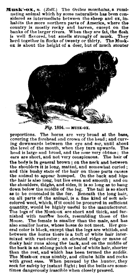 Musk-Ox, ---. Zell's Encyclopedia, 1876, 1 page. Posted April 24, 2004. SAMPLE PAGE. File size 428 KB PDF