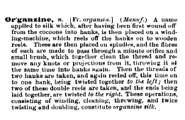 Organzine, ---. Zell's Encyclopedia, 1876, 1 page. Posted April 24, 2004. SAMPLE PAGE. File size 404 KB PDF