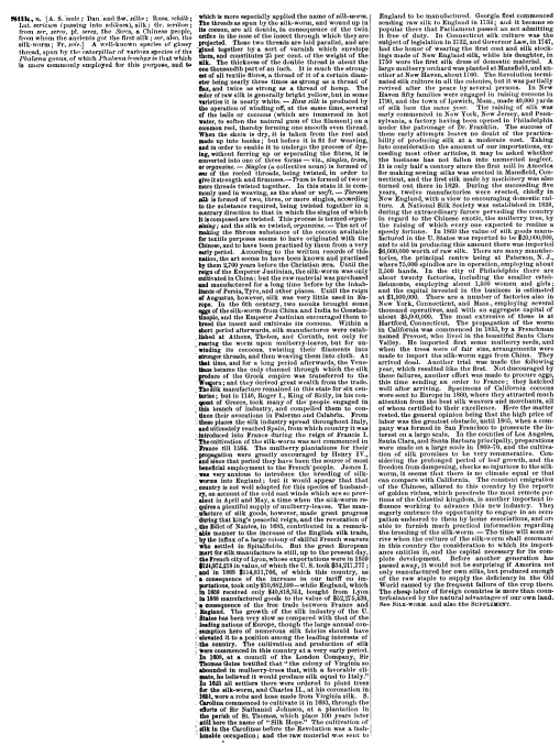 Silk, ---. Zell's Encyclopedia, 1876, 1 page. Posted August 13, 2003. SAMPLE PAGE. File size 544 KB PDF