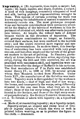 Tapestry, ---. Zell's Encyclopedia, 1876, 1 page. Posted April 25, 2004. SAMPLE PAGE. File size 420 KB PDF