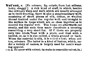Velvet, ---. Zell's Encyclopedia, 1876, 1 page. Posted April 25, 2004. SAMPLE PAGE. File size 404 KB PDF