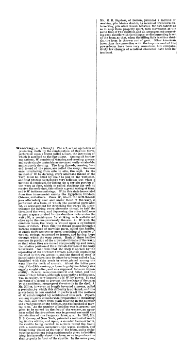 Weaving, ---. Zell's Encyclopedia, 1876, 1 page. Posted January 9, 2004. SAMPLE PAGE. File size 468 KB PDF