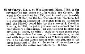 Whitney, Eli, ---. Zell's Encyclopedia, 1876, 1 page. Posted April 25, 2004. SAMPLE PAGE. File size 400 KB PDF