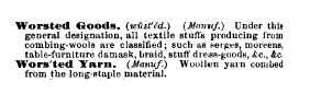 Worst Goods and Worsted Yarn, ---. Zell's Encyclopedia, 1876, 1 page. Posted April 25, 2004. SAMPLE PAGE. File size 396 KB PDF