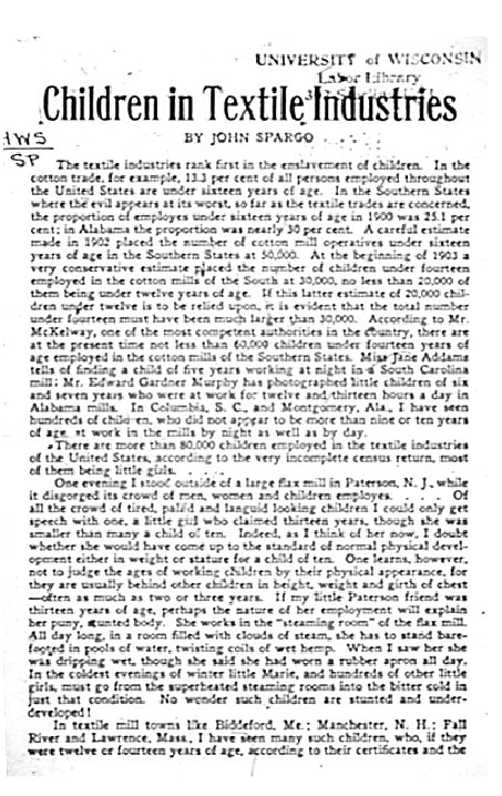 Children in Textile Industries, Spargo, John. 1903, 4 pages. Note: Scanned from micro-fiche; poor quality. CD (HWDA07). Posted October 27, 2003. SAMPLE PAGE. File size 720 KB PDF