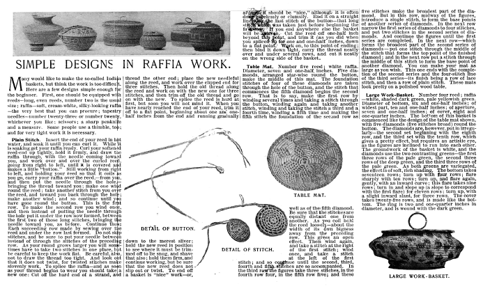 Simple Designs in Raffia Work, ---. 1 page. Note: Landscape mode. Posted November 4, 2002. SAMPLE PAGE. File size 636 KB PDF