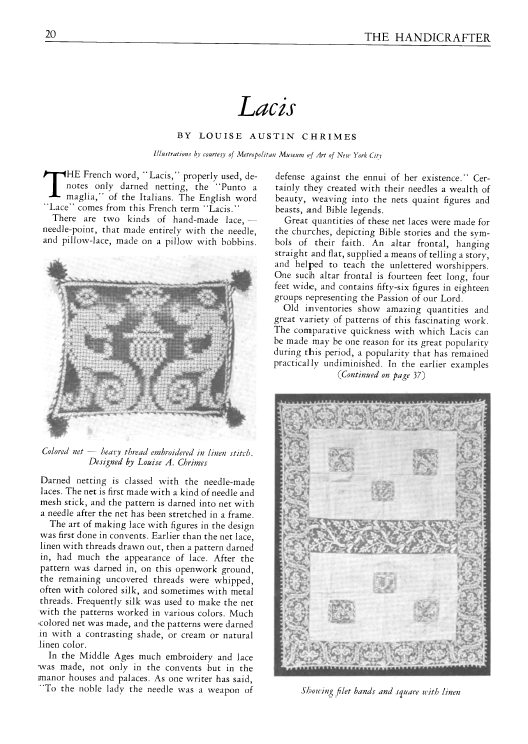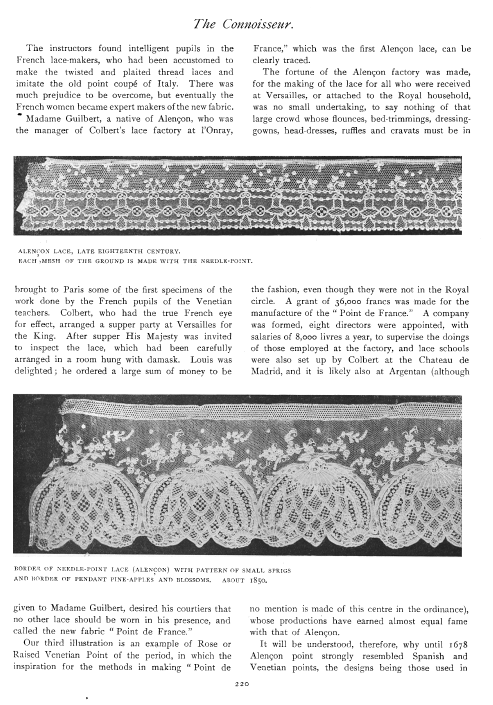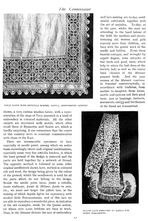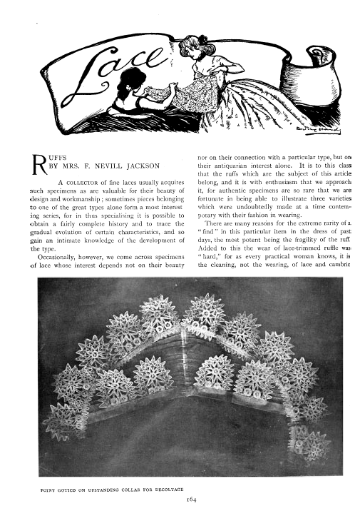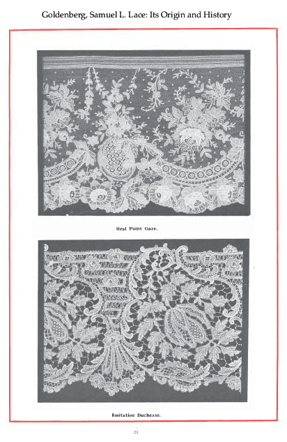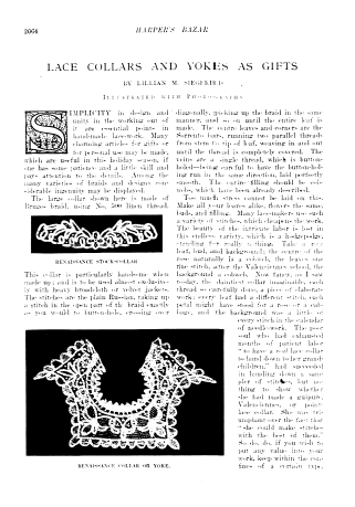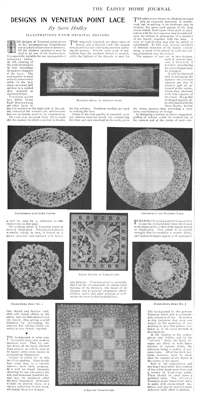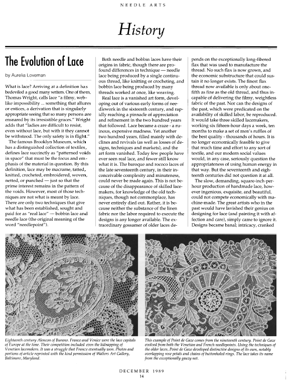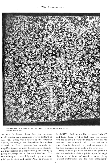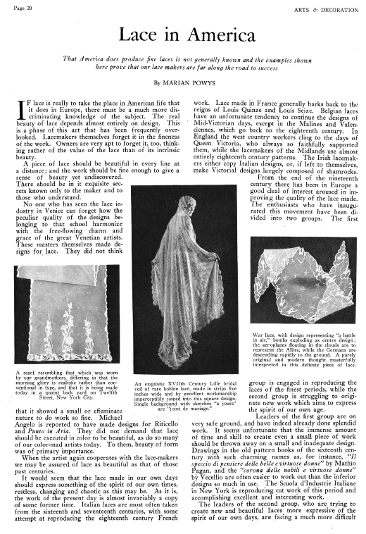 Lace in America, Powys, Marian. Arts and Decoration, Vol. 12 (1919-1920), 2 pages. Note: Reduced to 85% to fit on page. Posted June 18, 2004. CD (HWDA10). SAMPLE PAGE. File size 912 KB PDF