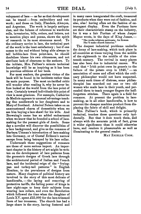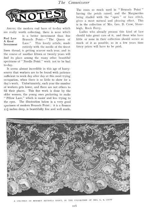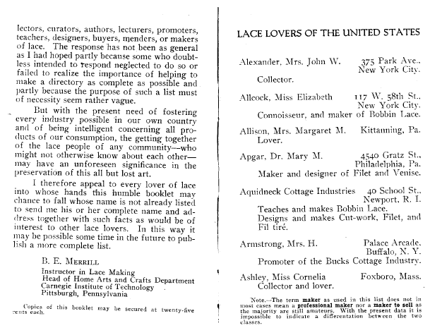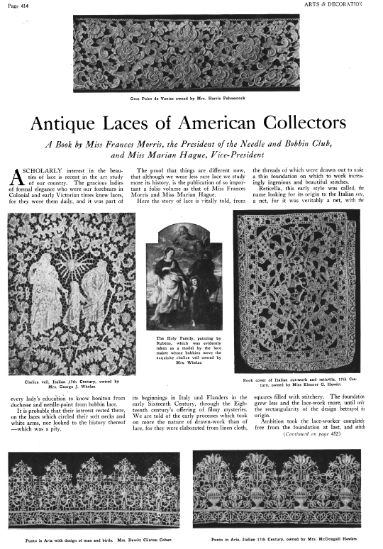 Antique Laces of American Collectors, ---. Arts and Decoration, Vol. 12 (1919-1920), 2 pages. Note: Reduced to 85% to fit on page. Book review. Posted June 18, 2004. CD (HWDA10). SAMPLE PAGE. File size 912 KB PDF