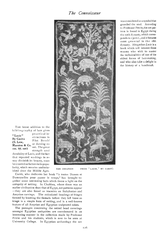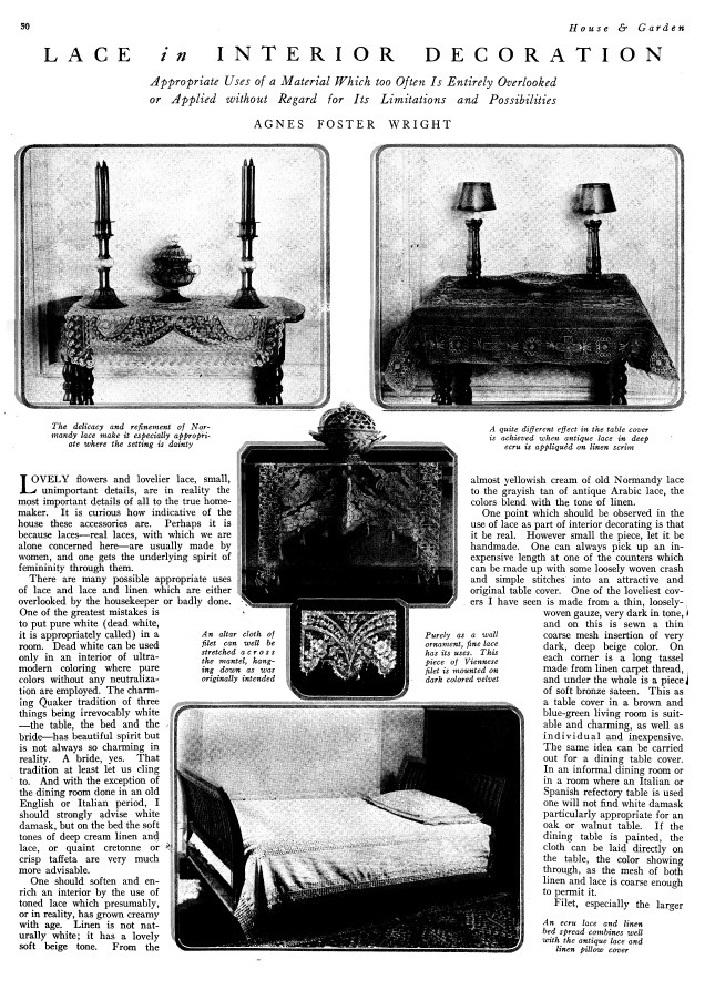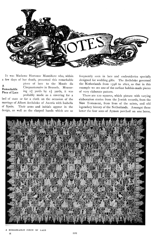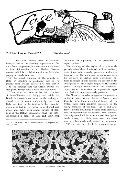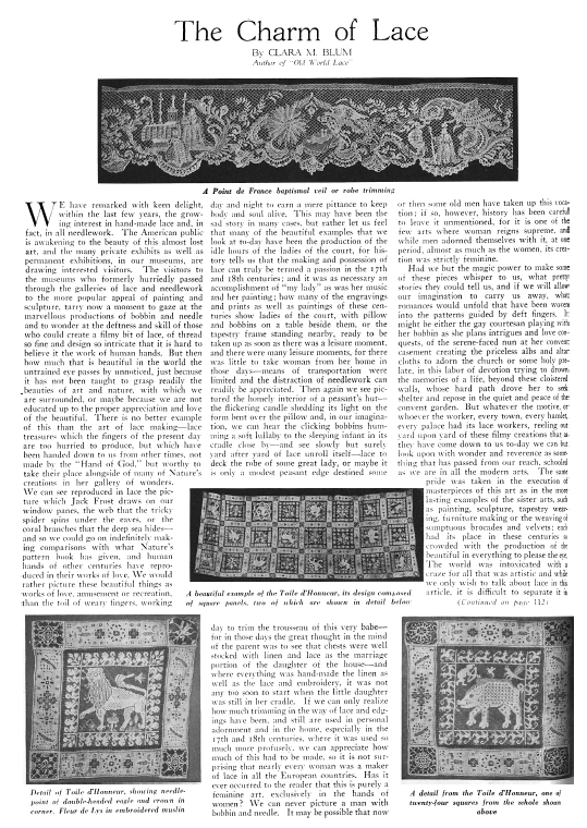 Charm of Lace, Blum, Clara M. Arts and Decoration, Vol. 15 (1921), 2 pages. Posted September 19, 2003. CD (LDA03). SAMPLE PAGE. File size 1.6 MB PDF