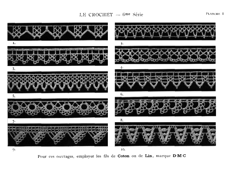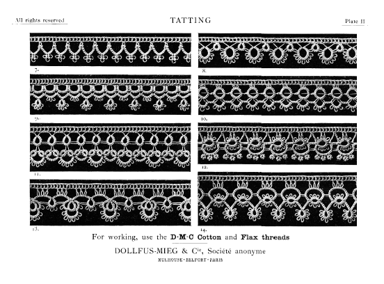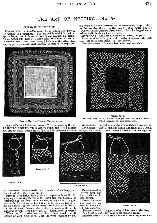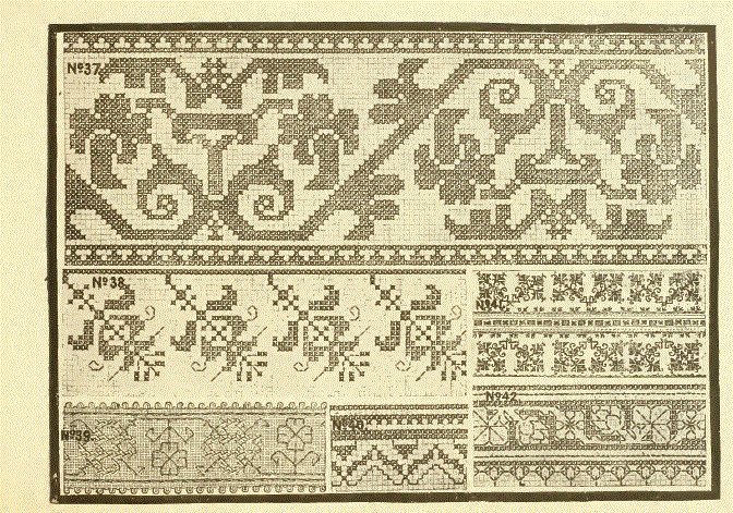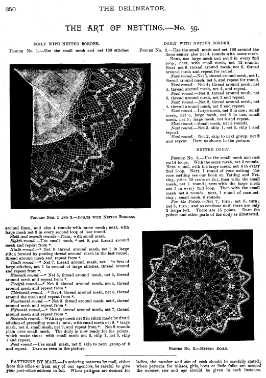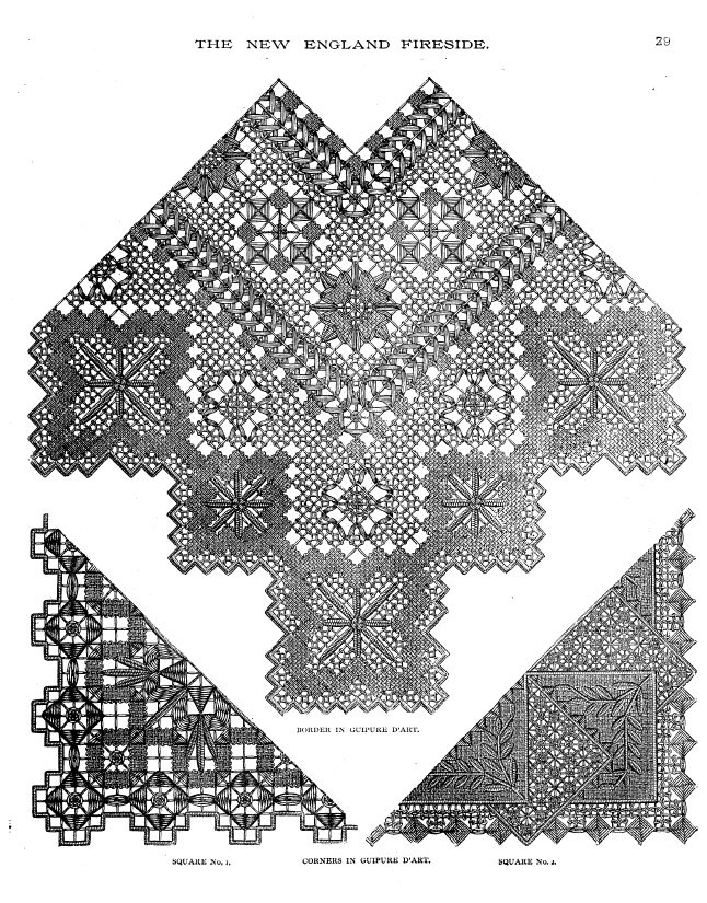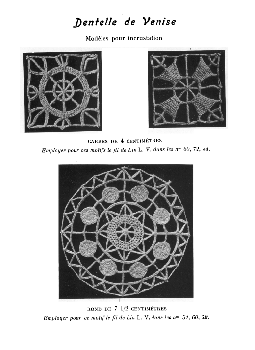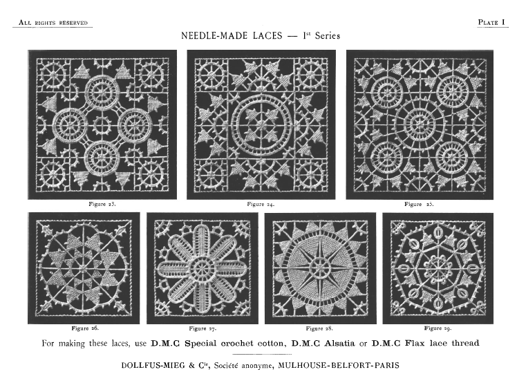 Dessins nouveaux de Filet Brodé [New Designs for Filet Lace], P.-Verness, M. Appleton's Encyclopedia, Vol. 26 (December 1909), 5 pages. Posted June 16, 2005. SAMPLE PAGE. File size 3 MB PDF