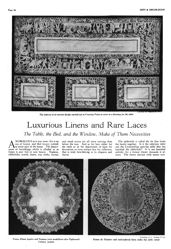 Luxurious Linens and Rare Laces, ---. Arts and Decoration, June 25, 1980, 3 pages. Note: Reduced to 80 % to fit on page. Posted June 24, 2005. SAMPLE PAGE. File size 3.2 MB PDF