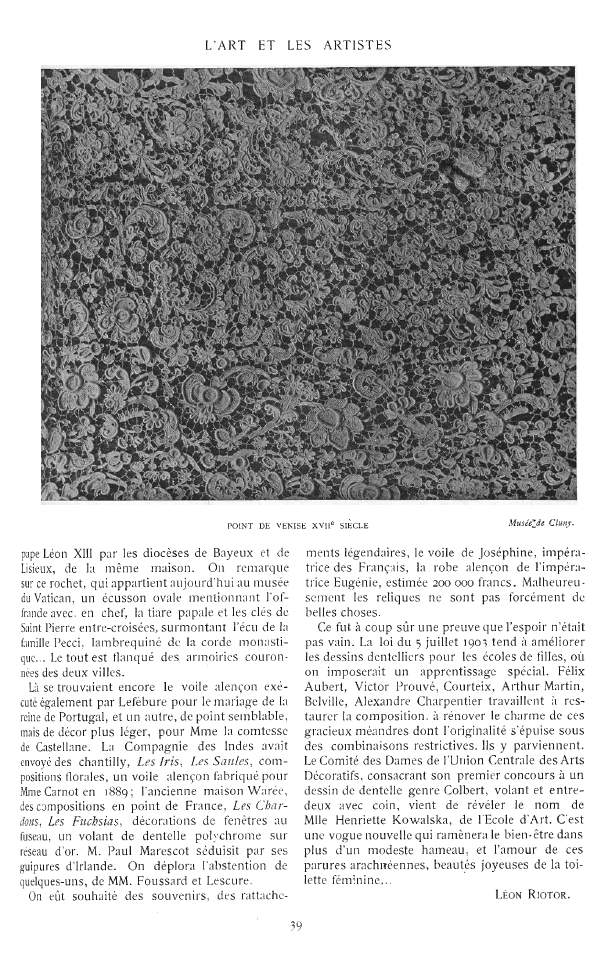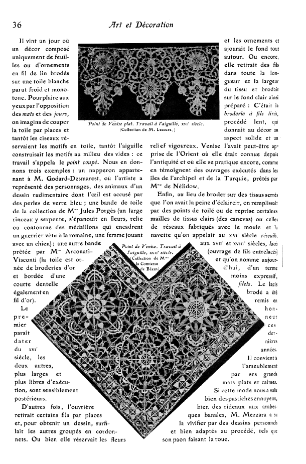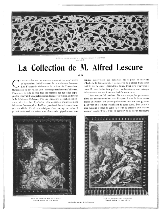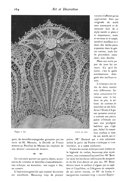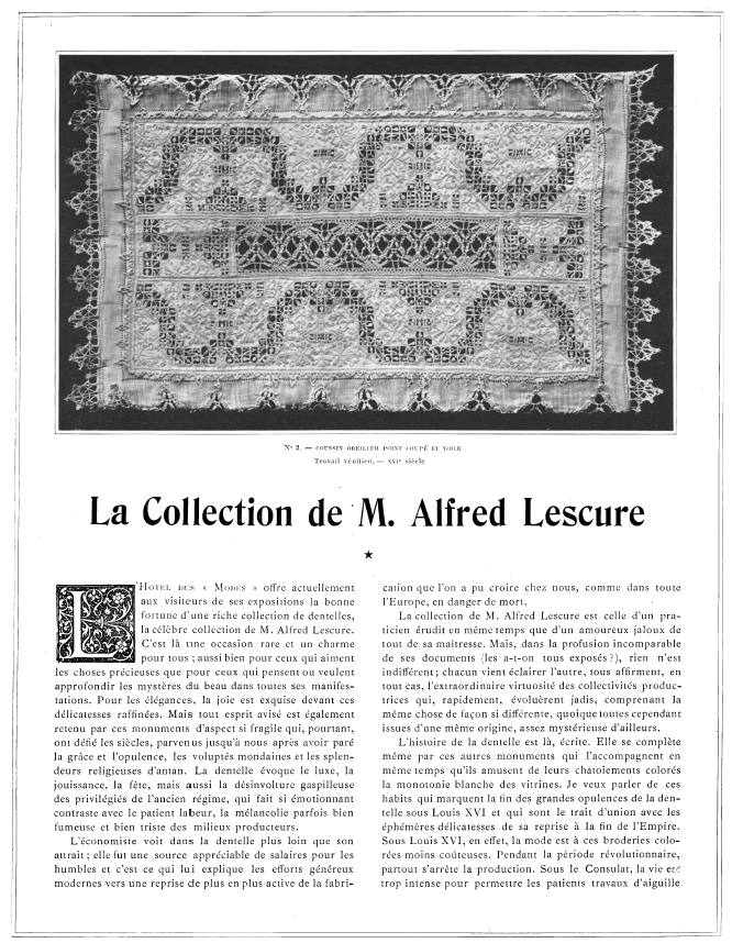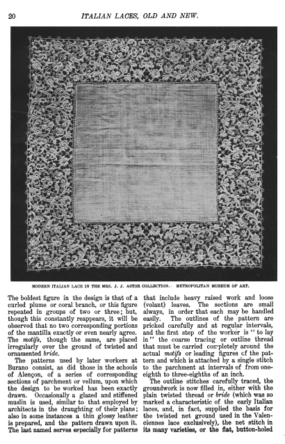 L' Éxposition de Dentelles Anciennes & Modernes au Musée des Arts Décoratifs [Exhibition on Antique and Modern Laces in the Musée des Arts Décoratifs, Deshairs, L. Appleton's Encyclopedia, Vol. 20 (August 1906), 36 pages. Posted June 27, 2005. SAMPLE PAGE. Part 1: File size 7.9 MB PDF. Part 2: File size 8.3 MB PDF. Part 3: File size 7.6 MB PDF.