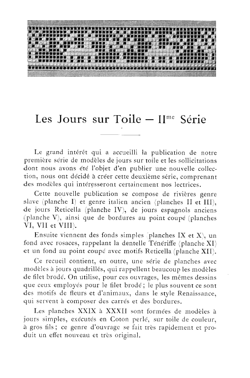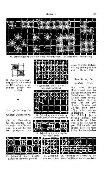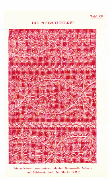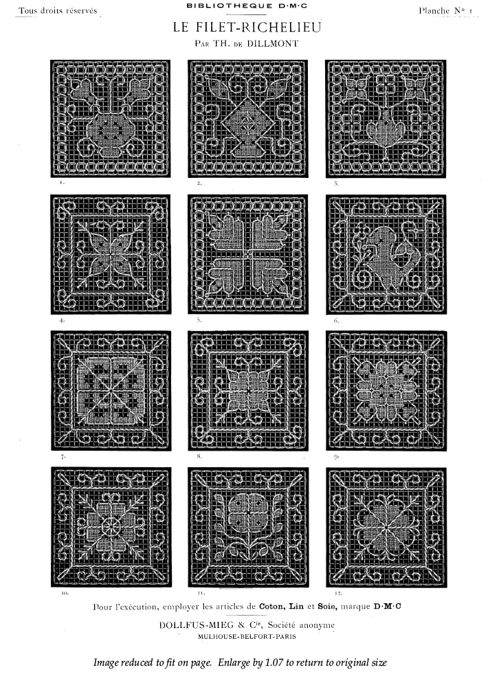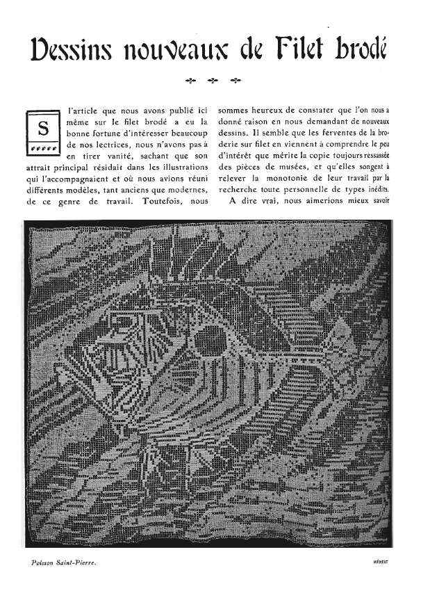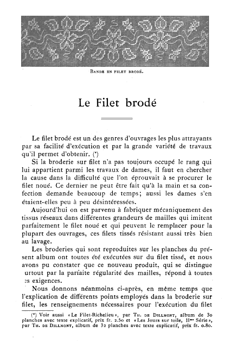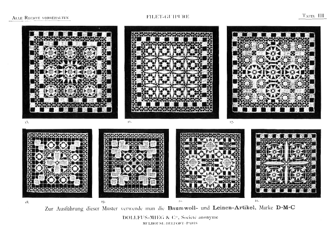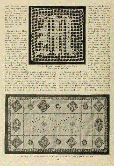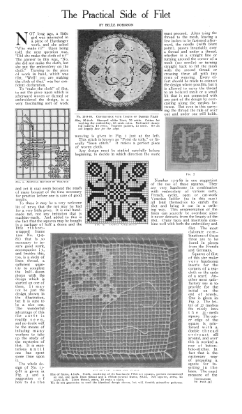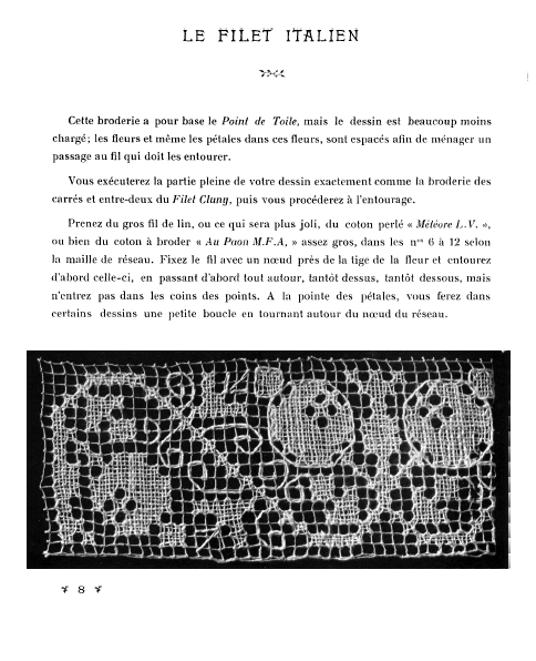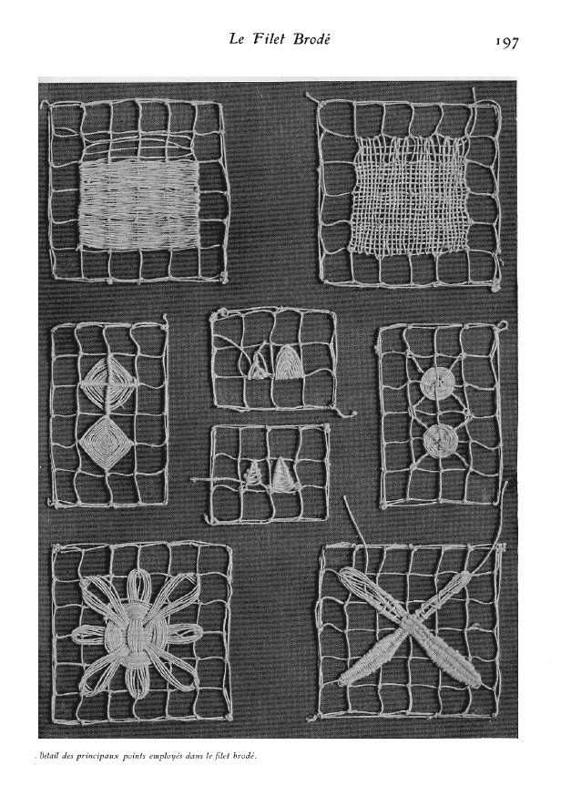 Le Filet Brodé [Filet Lace], P.-Verness, M. Appleton's Encyclopedia, Vol. 24 (December 1908), 14 pages. Posted June 16, 2005. SAMPLE PAGE. File size 6.4 MB PDF