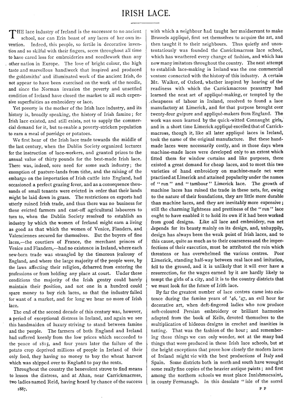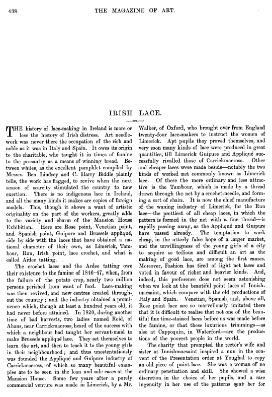 Irish Lace, Robinson, Mabel F. Art Journal, Vol. 50 (1887), 3 pages. Posted November 2, 2003. CD (LDA04). SAMPLE PAGE. File size 700 KB PDF