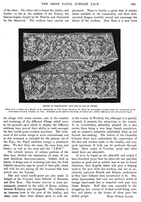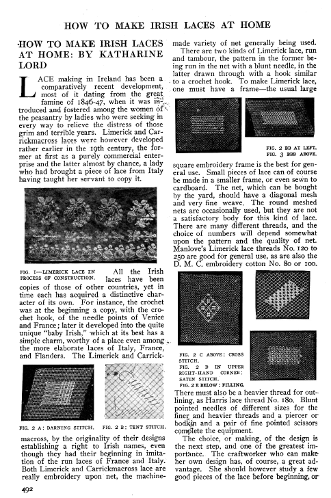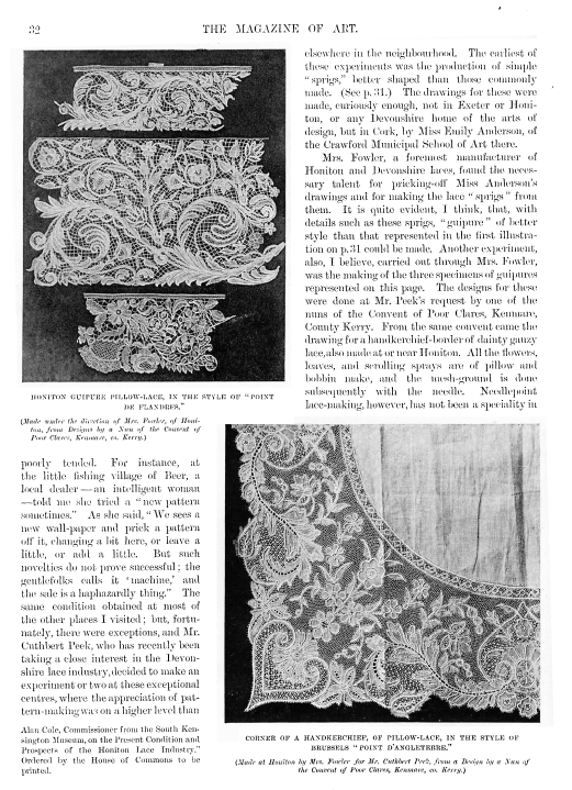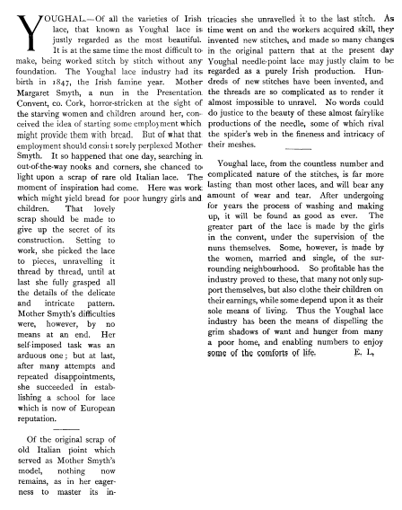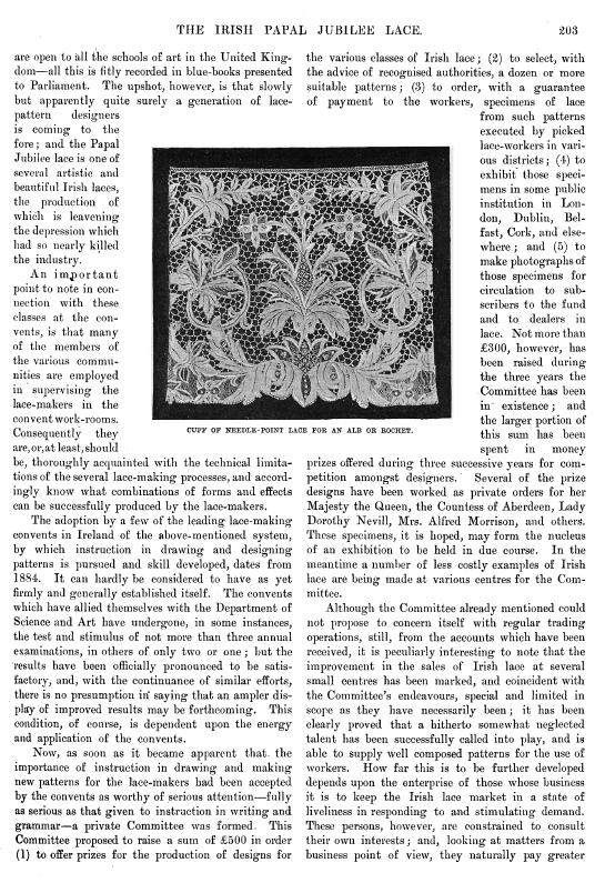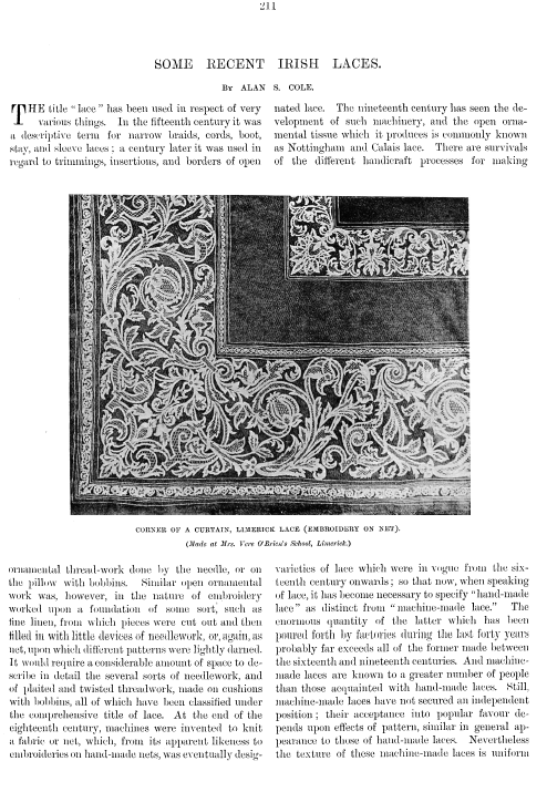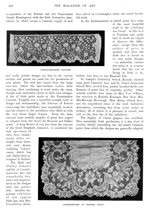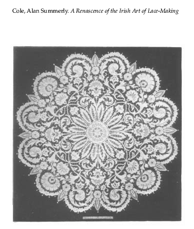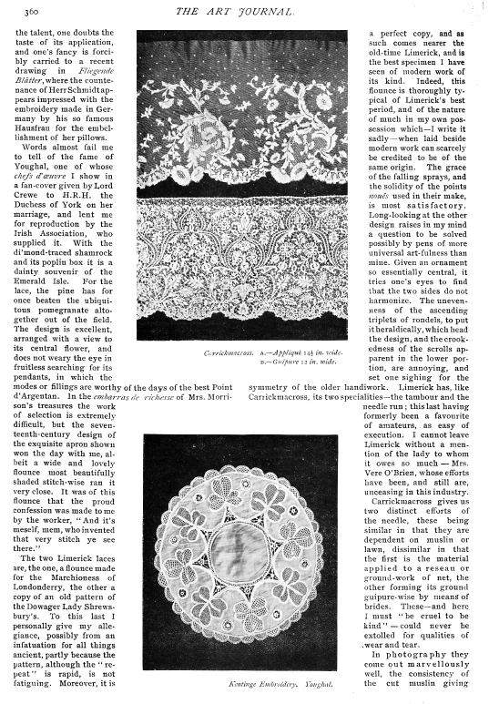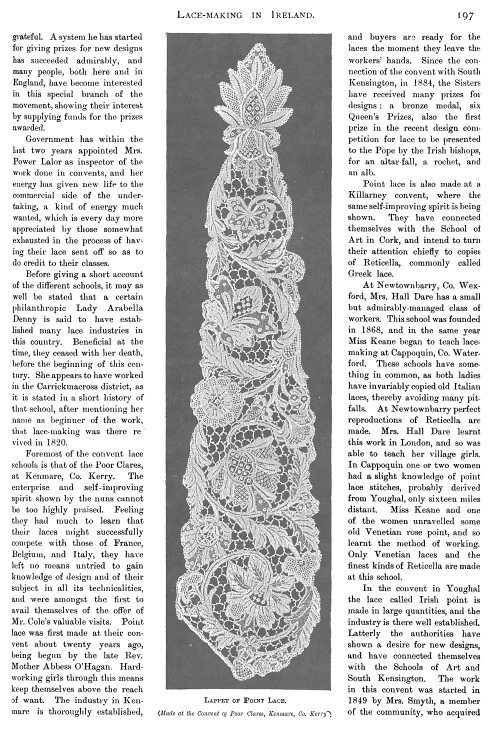 Irish Lace, Clarke, Effie Bruce. Art Journal, Vol. 59 (1897), 4 pages. Posted January 5, 2004. CD (LDA04). SAMPLE PAGE. File size 1.7 MB PDF