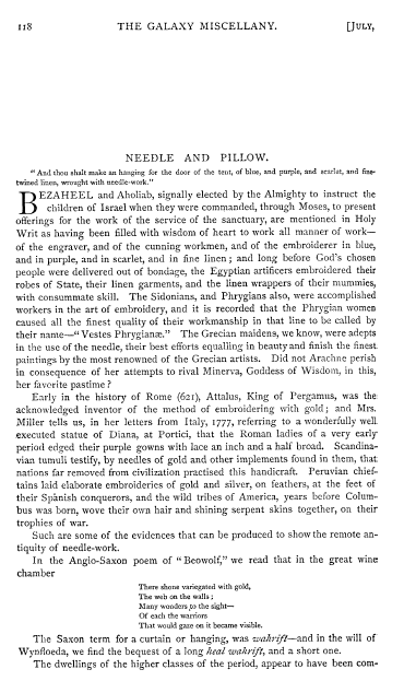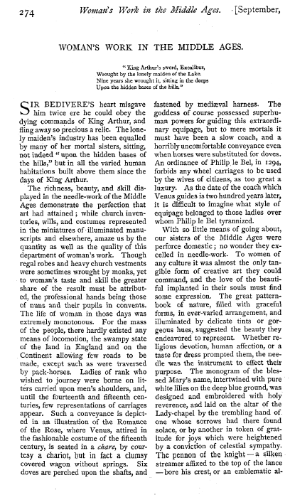 Woman's Work in the Middle Ages, Waterson, R. C. Atlantic Monthly, Vol. 18, No. 107 (September 1866), 15 pages. Posted March 8, 2005. SAMPLE PAGE. File size 4.9 MB PDF