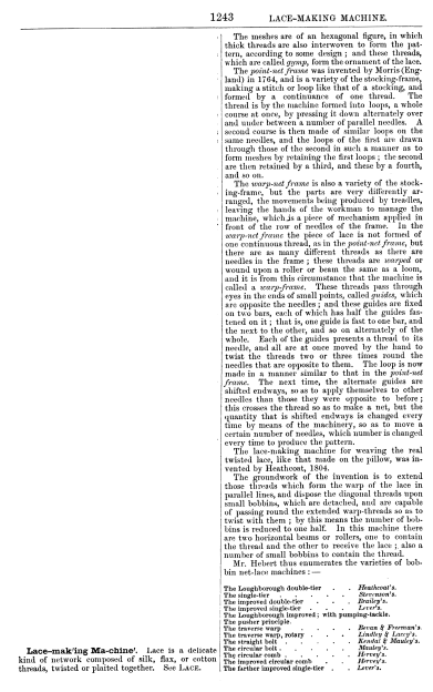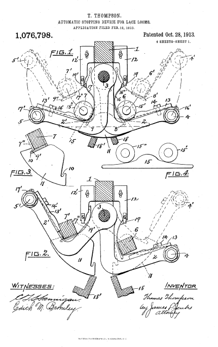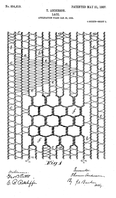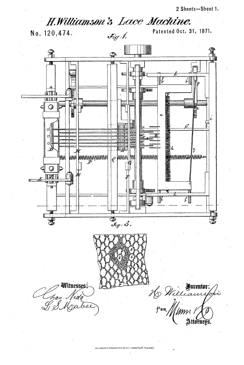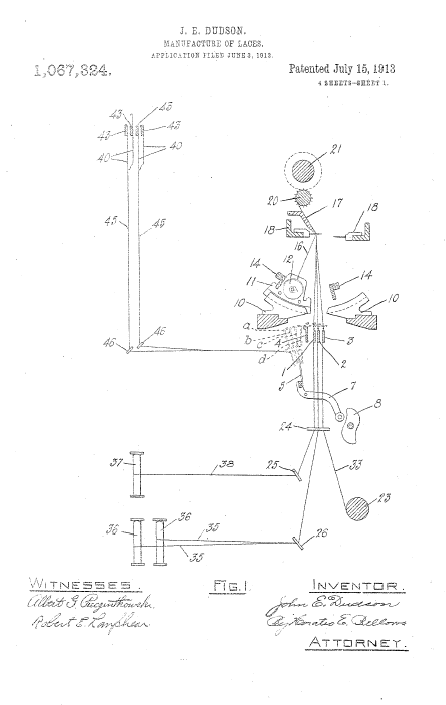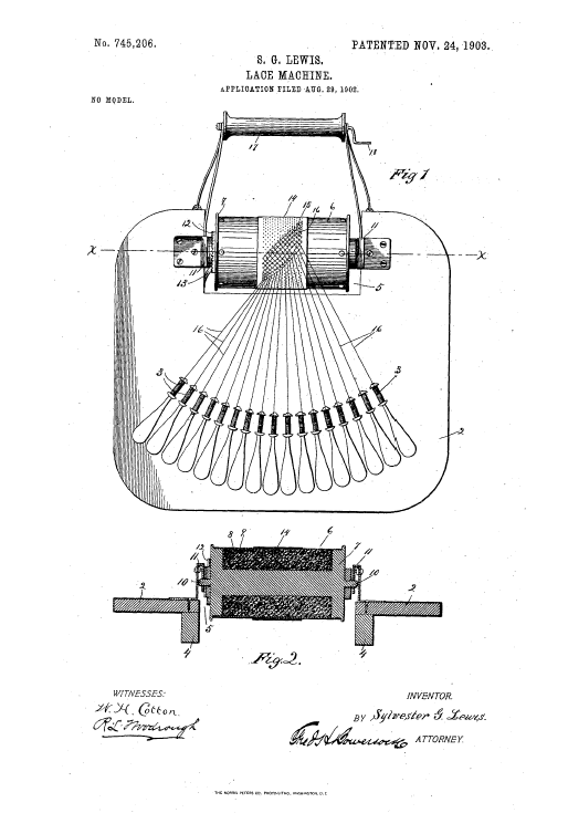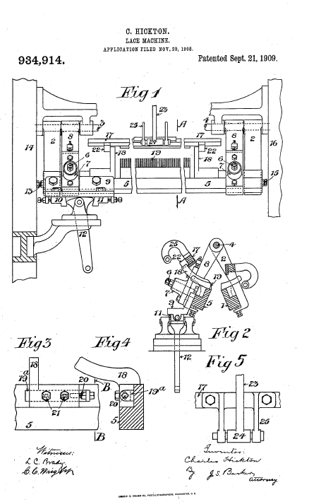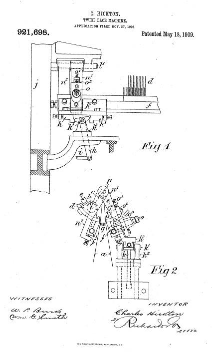 Twist Lace Machine, US00921698, Hickton, C.. May 18, 1909, 3 pages. Posted January 22, 2005. SAMPLE PAGE. File size 592 KB PDF