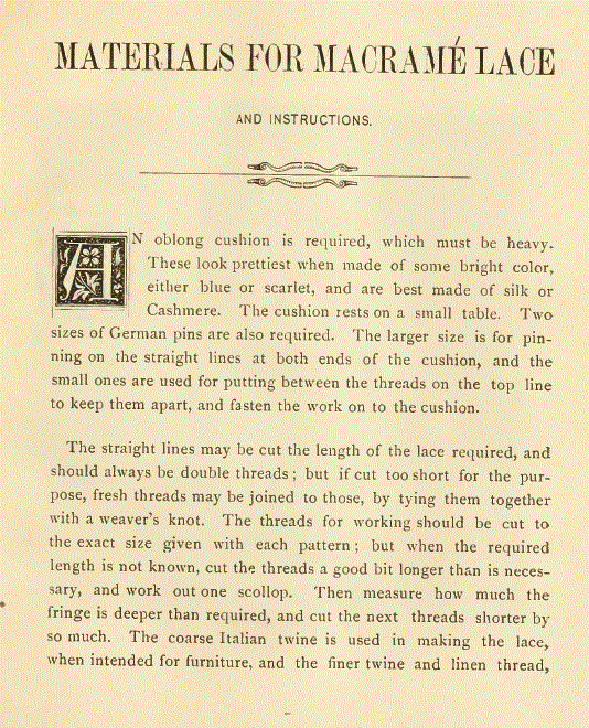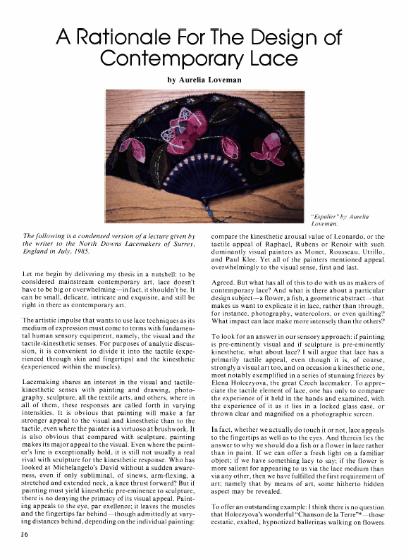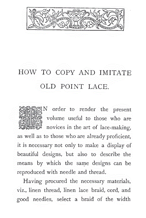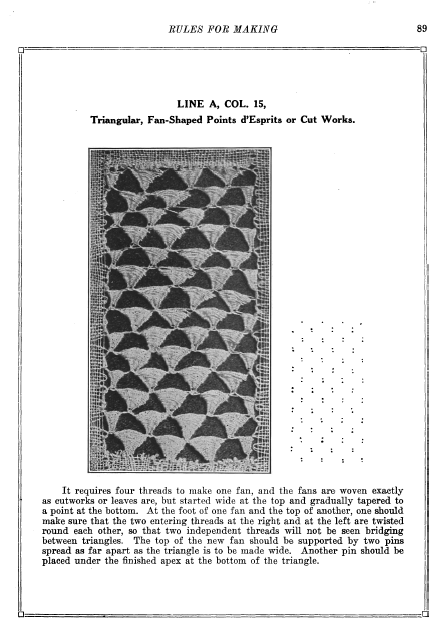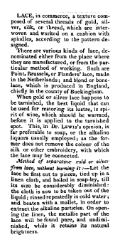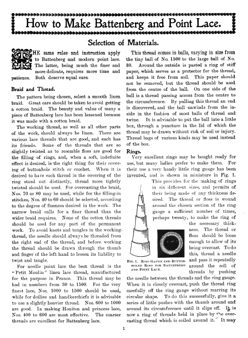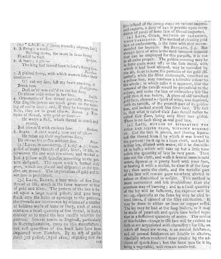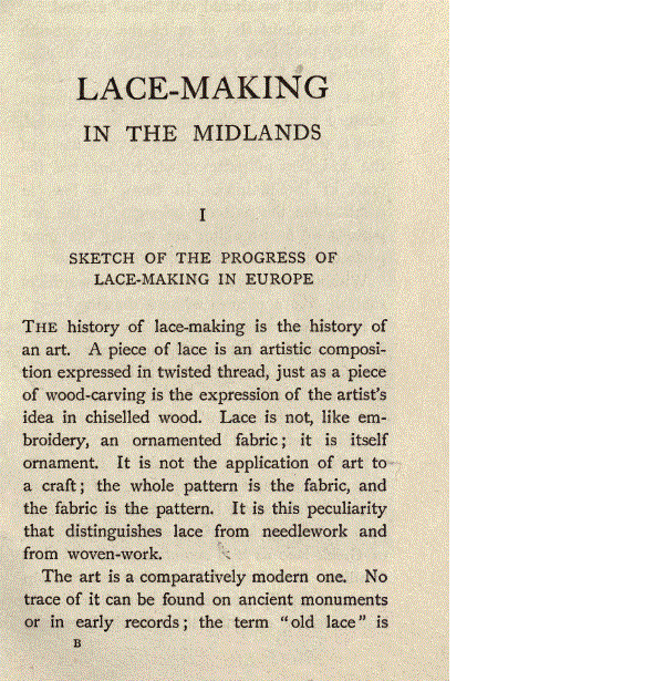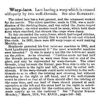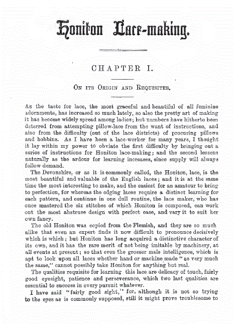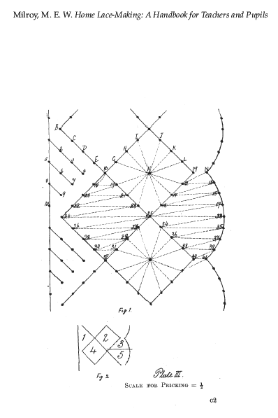 Merritt, Elaine. A Dissertation on the Open and Closed Methods of Making Lace, 3 pages. Note: By permission of the author. Posted March 25, 2005. FIRST PAGE. File size 38 KB PDF
