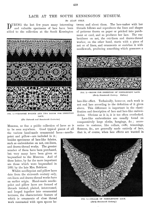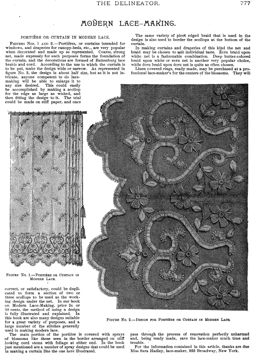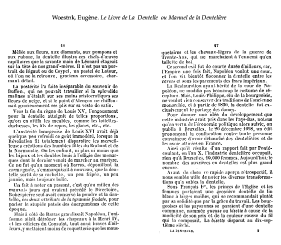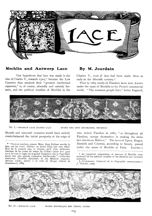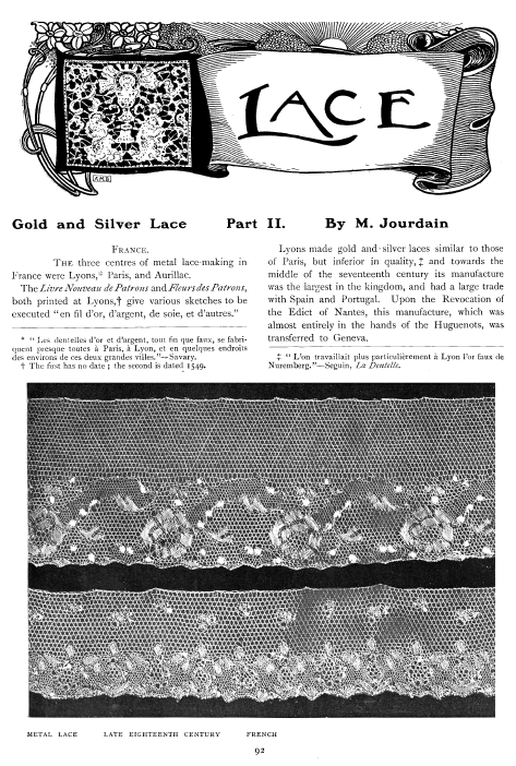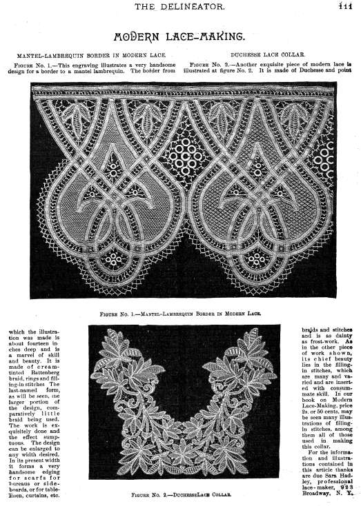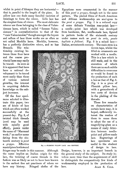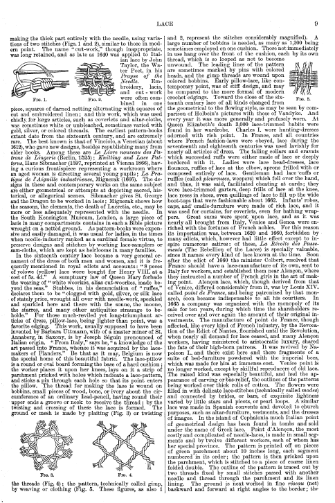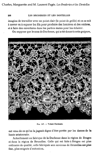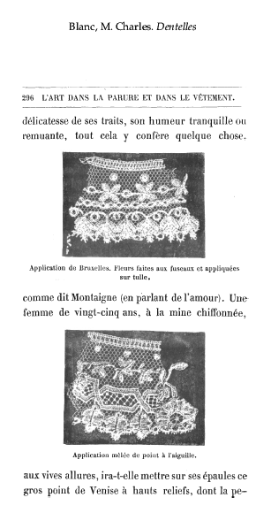 La Broderie et la Dentelle á l'Éxposition [Embroidery and Lace at the Exhibition], Soulier, Gustave. Appleton's Encyclopedia, Vol. 9 (June 1901), 6 pages. Posted June 15, 2005. SAMPLE PAGE. File size 2.2 MB PDF