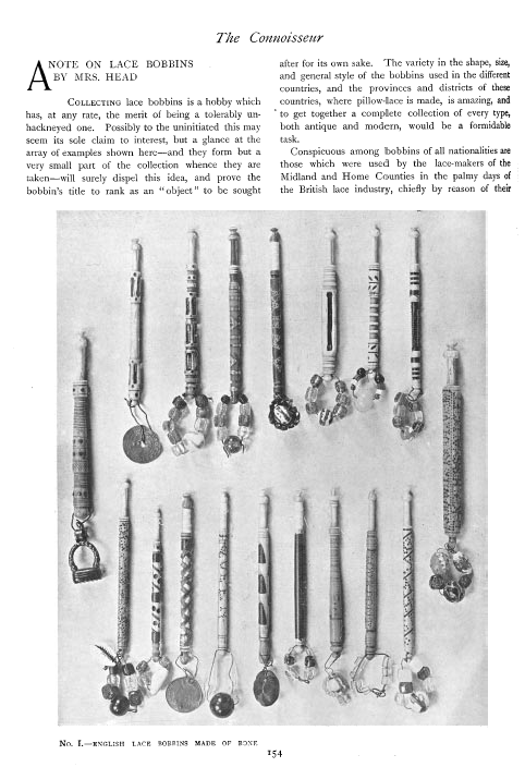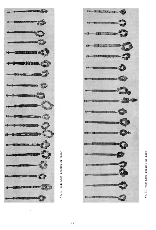 Lace Bobbins, ---. The Bulletin of the Needle and Bobbin Club, Vol. 1, No. 1 (1916), 8 pages. Note: Scanned images provided by Tess Parrish. Posted March 15, 2004. CD (LDA04). SAMPLE PAGE. File size 1 MB PDF