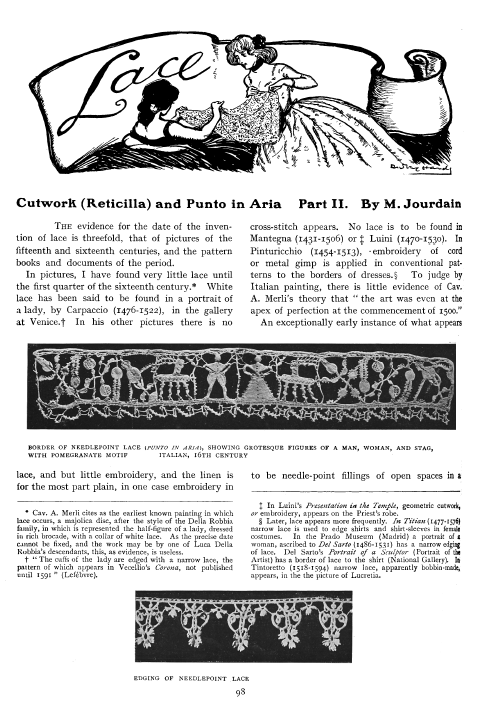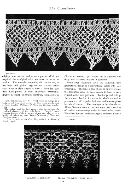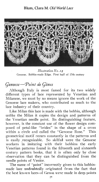 Lace and Its Development, Part II: Venetian Point and Genoese Bobbin Lace, Milliken, William Mathewson. Antiques, Vol. 2 (July 1922), 6 pages. Posted June 1, 2003. CD (LDA02). SAMPLE PAGE. File size 1.4 MB PDF