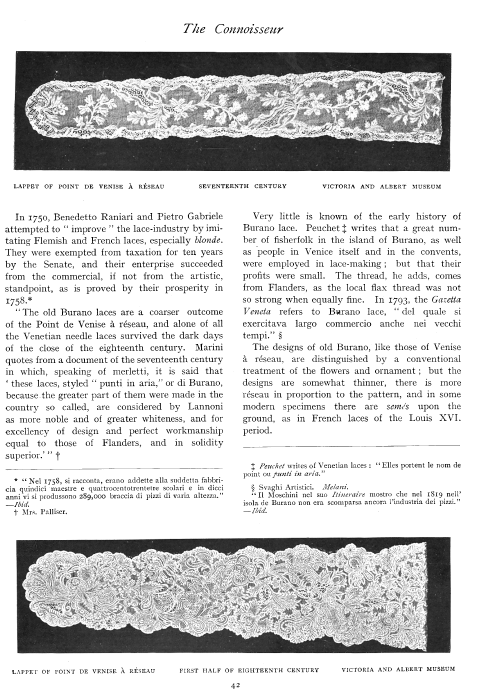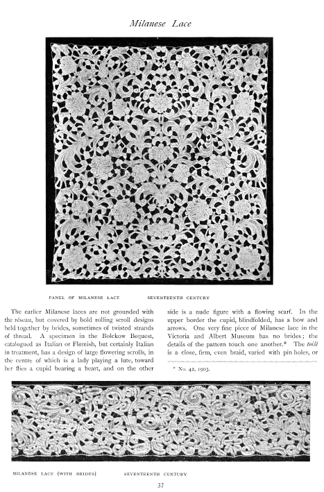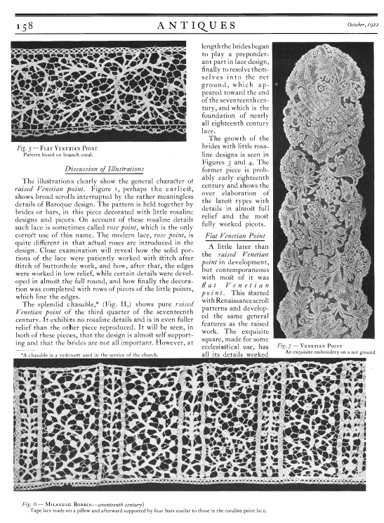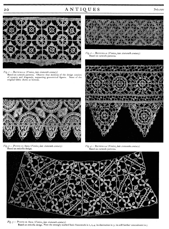 Lace and Its Development, Part III: Venetian Point and Punto de Milano, Milliken, William Mathewson. Antiques, Vol. 2 (October 1922), 7 pages. Posted June 2, 2003. CD (LDA02). SAMPLE PAGE. File size 1.9 MB PDF