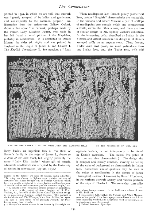 Lace Collection of the Musée des Arts Décoratifs, Paris, Johnstone, Margaret Taylor. The Bulletin of the Needle and Bobbin Club, Vol. 5, No. 1 (1921), 7 pages. Posted September 19, 2003. CD (LDA04). SAMPLE PAGE. File size 1.6 MB PDF