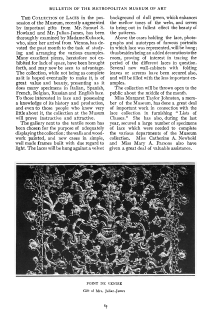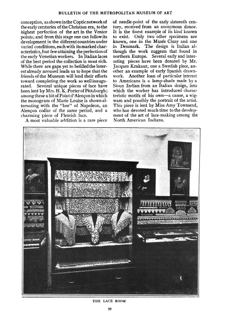The Lace Room, ---. Bulletin of the Metropolitan Museum of Art, 1906, 3 pages. Posted May 7, 2005. SAMPLE PAGE. File size 820 KB PDF