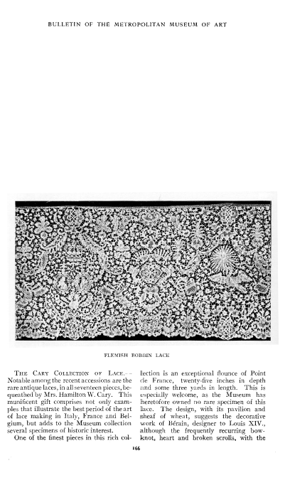The Cary Collection of Lace, ---. Bulletin of the Metropolitan Museum of Art, 1906, 2 pages. Posted May 7, 2005. SAMPLE PAGE. File size 752 KB PDF